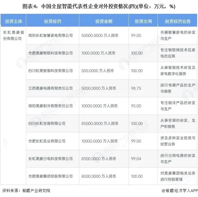 从中国全屋智能代表性企业的对外投资来看,全屋智能企业对外投资的企业数量较多,多以设立子公司进行产业链延伸、技术服务为主。