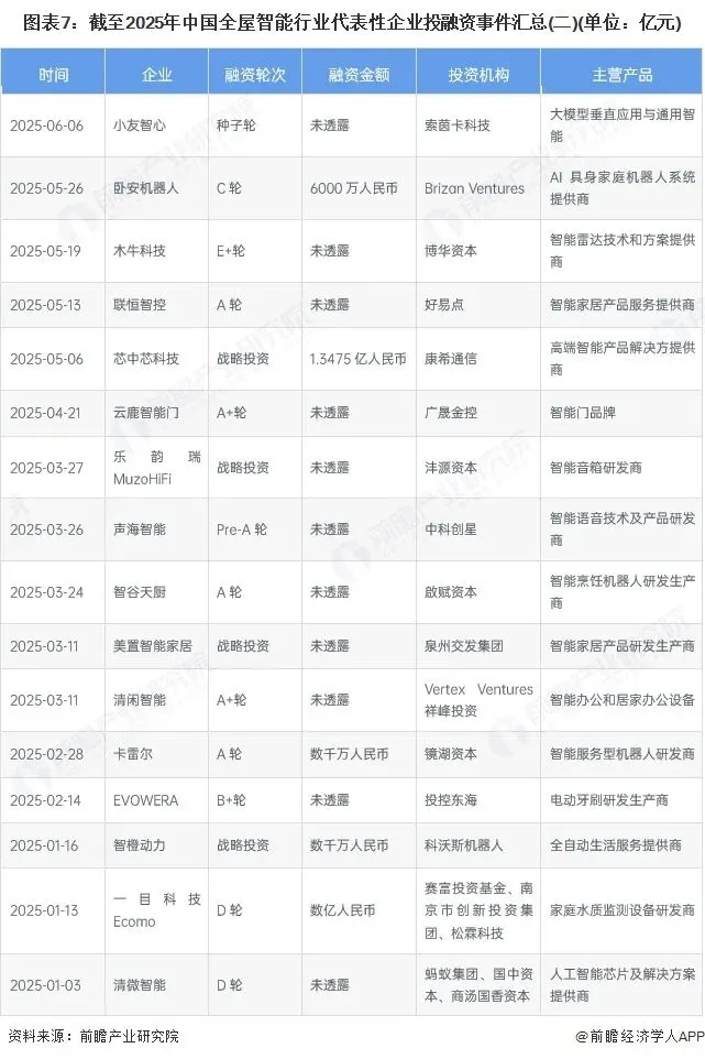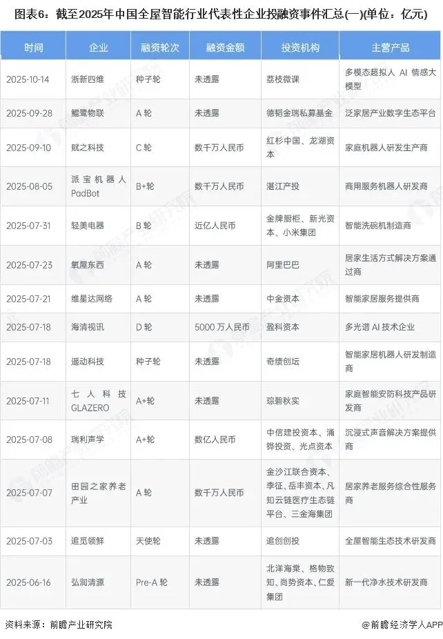截至2025年10月,中国全屋智能行业融资事件较多,融资企业的业务种类多样,包括家居电器智能化等技术研发,截至2025年中国全屋智能行业投融资事件汇总如下: