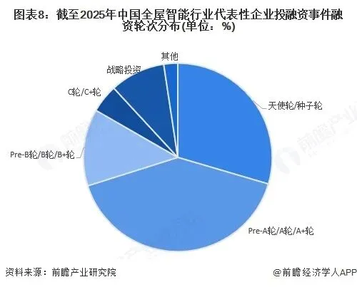 从中国全屋智能行业投融资事件轮次分布情况来看,根据汇总的融资事件情况来看,天使轮/种子轮融资事件数量占比29.6%,Pre-A轮/A轮/A+轮事件数量占比约40.6%,Pre-B轮/B轮/B+轮事件数量占比约13.2%,战略投资事件数量占比约9.5%。整体来看,大多数企业的融资轮次在Pre-A轮/A轮/A+轮事件。反映全屋智能行业处于融资成长期。