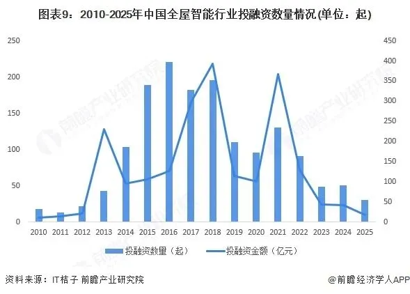 根据IT桔子数据库,我国全屋智能行业相关企业投融资数量先增长后下降趋势,2016年投融资数量较高,达到221件。从金额来看,2018年和2021年的融资金额出现高峰,融资金额分别为392.86亿元和367.75亿元。2024年全年,全屋智能融资事件为51件,融资金额41.98亿元。2025年1-10月,全屋智能融资事件数量分别为30件和17.29亿元。