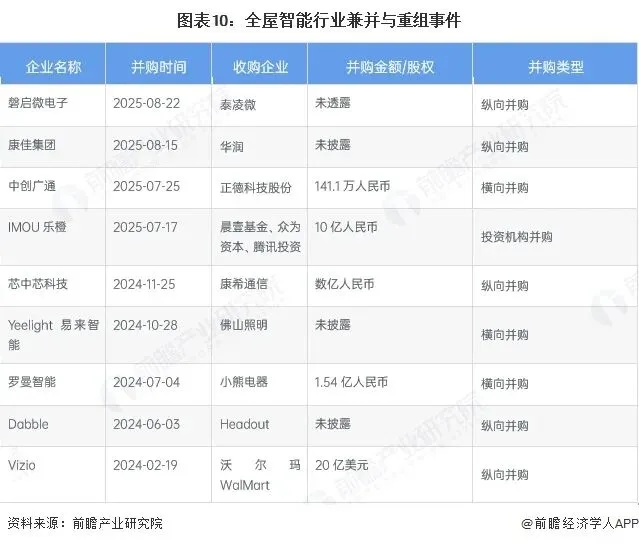 中国全屋智能行业整体兼并重组事件主要分为纵向并购和横向并购,纵向并购主要是产业链下游企业对智能家居企业的收购,横向并购主要包括是智能家居企业扩大产品类型的相关收购,截至2025年中国全屋智能行业兼并与重组事件如下所示: