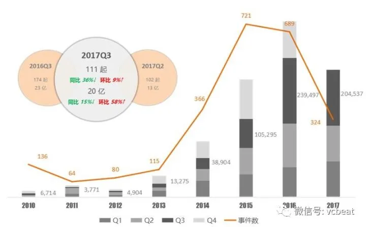 可见,2017Q3仅以2014年30%的投资事件数,便得到了比2014全年还多的融资规模。