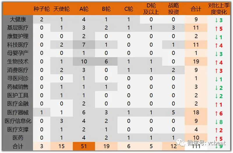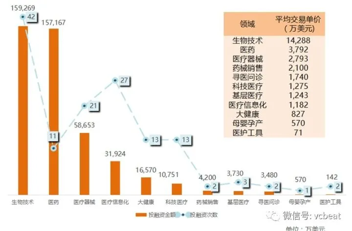 在细分领域的投资热度分布上,有一定技术壁垒的细分领域,如医疗器械、生物技术的投资热度比较高;而服务模式创新的领域,如母婴孕产、寻医问诊的投资热度在降低。
