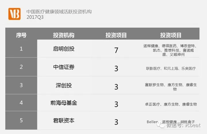 2017年Q3最活跃的医疗健康投资机构是启明创投,投资项目为7个。其他活跃投资机构分别是中信证券、深创投等。