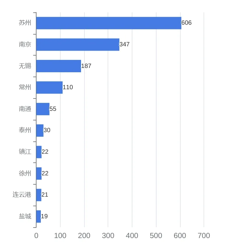 从融资事件发生的地区来看,2023年事件数量排名前五的地区为苏州(606个)、南京(347个)、无锡(187个)、常州(110个)、南通(55个)。
