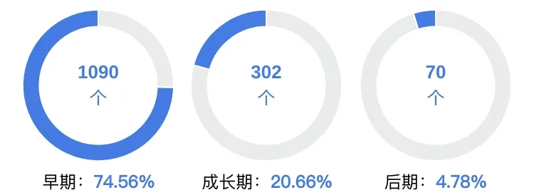 阶段分布上:早期(1090个)、成长期(302个)、后期(70个)。