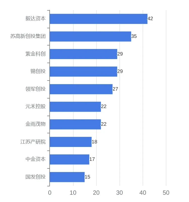 从投资事件数来看,排名前五的VC/PE机构为:毅达资本(42个)、苏高新创投集团(35个)、紫金科创(29个)、锡创投(29个)、领军创投(27个)。