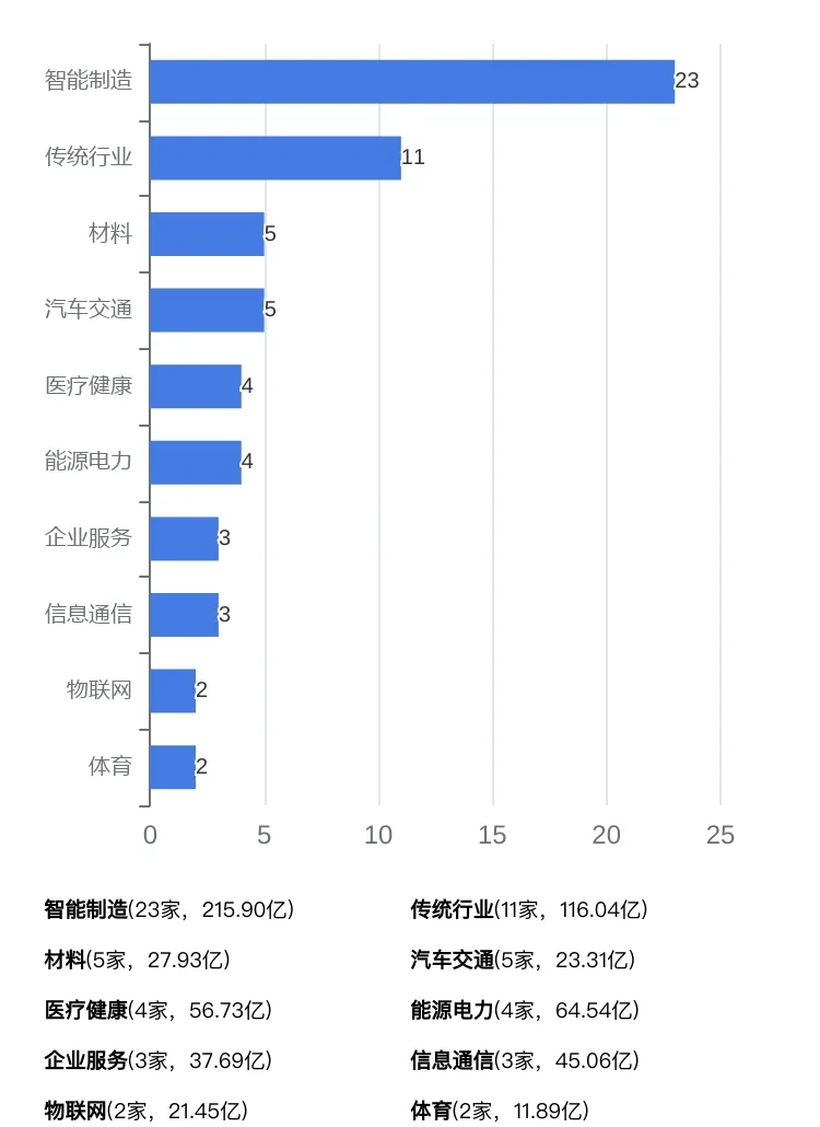 2023年完成IPO上市的企业共集中在13个行业,排名前五的行业为:智能制造(23家)、传统行业(11家)、材料(5家)、汽车交通(5家)、医疗健康(4家)。