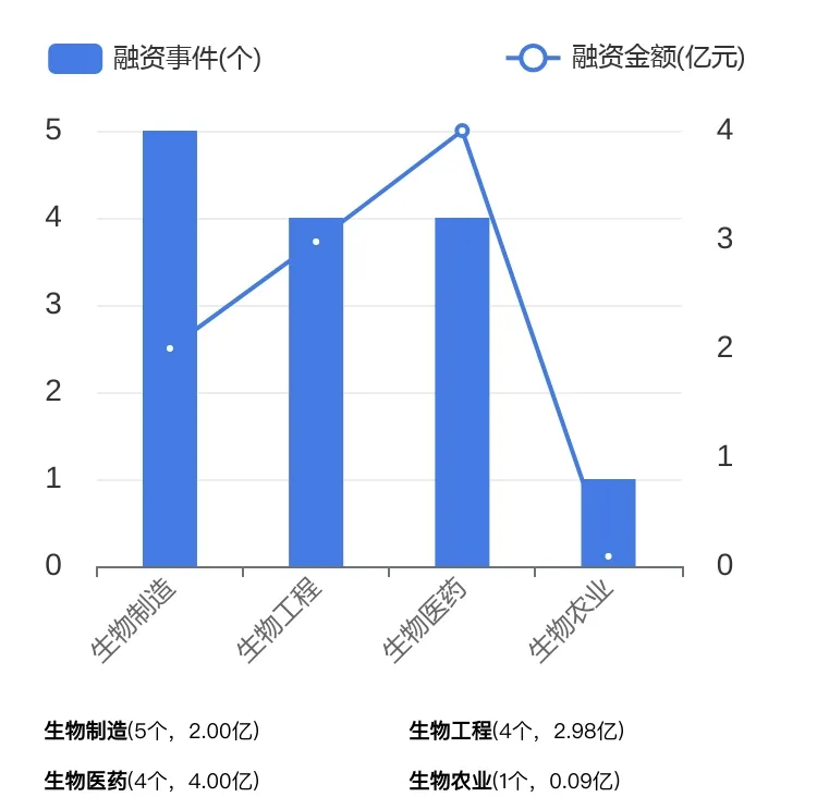 2023年11月,「生物科技」行业热门融资细分赛道主要为:生物制造(5个)、生物工程(4个)、生物医药(4个),其中生物制造行业较上月上升较多 (