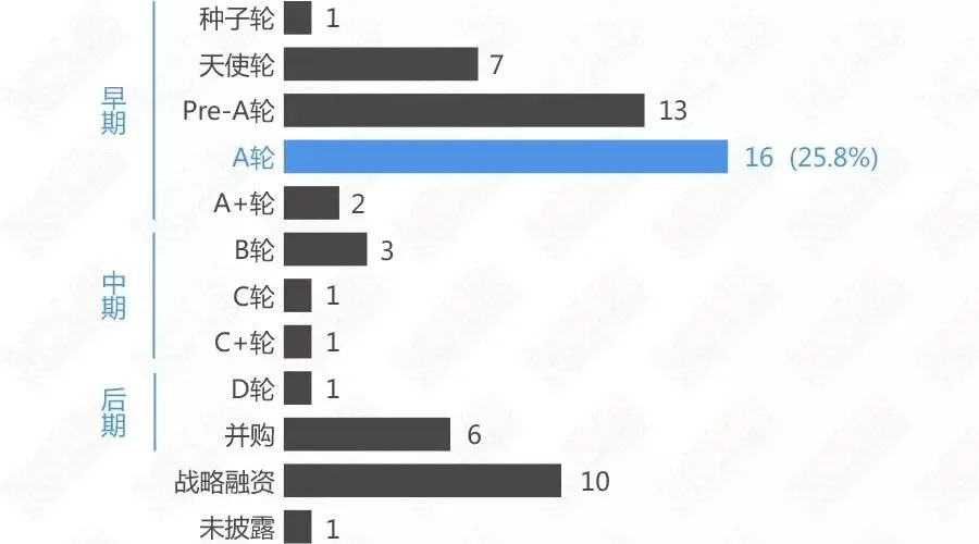 如果我们把种子轮、天使轮、Pre-A轮、A轮、A+轮归为早期,经过计算,39起早期阶段中,披露融资的37家公司的早期融资总金额达到9.54亿。中期融资阶段(B、B+、C、C+轮)的案例有5起,披露金额的4家总金额为6.3亿元。而后期阶段(D轮以后及并购)的案例共7起,披露融资金额的5起案例总金额为10.37亿元。