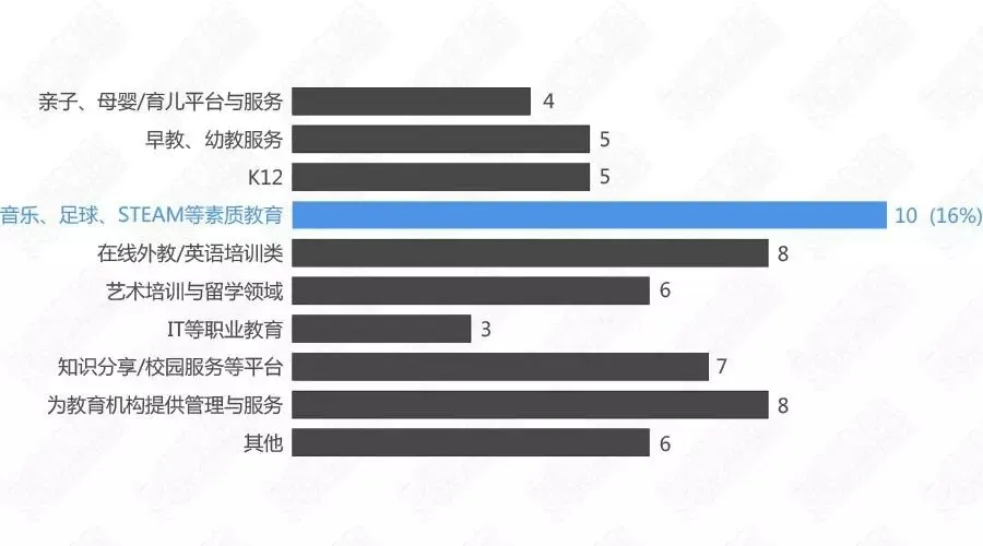 通过梳理和研究我们发现,2017年第一季度,从早教幼教到K12,从英语培训、素质教育到职业教育,从知识分享到为机构提供各种服务和技术等等,各个细分领域融资不断。不过,值得一提的是,今年Q1融资最活跃的细分领域是音乐、足球、STEAM等素质教育领域,这一领域的融资约有10起,占比超过16%。