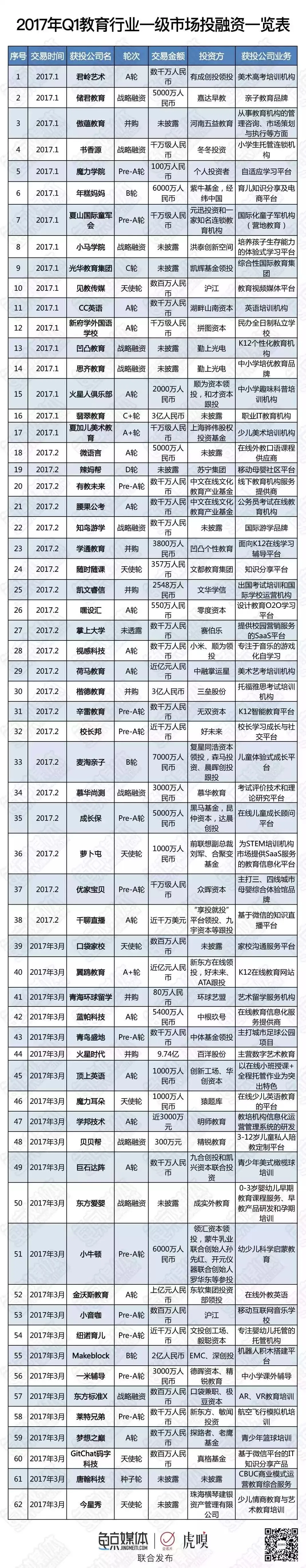 在研究了2017年Q1教育行业一级市场62起投融资事件、分析了超过30亿元人民币的教育投资额后,我们发现: