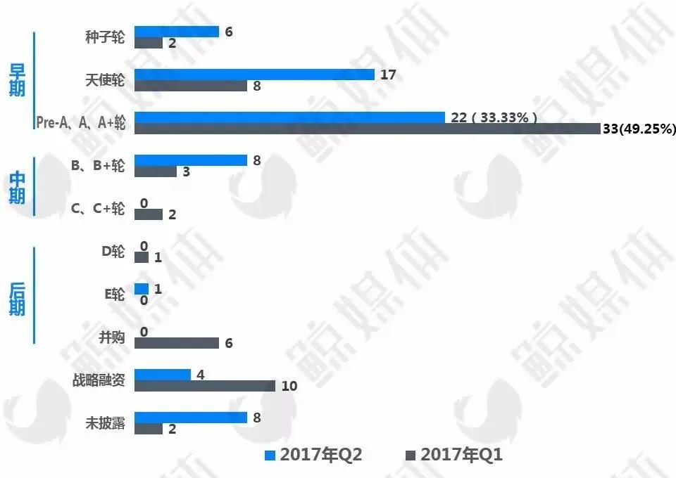 从投资方的情况来看,2017年第二季度,财务投资人(含产业基金)的投资事件有40起,占比超60%,比Q1略有上升(Q1为53.73%)。如果把拟跨界的公司和上市公司、教育公司等产生业务协同的投资都归为战略投资人,那么Q2的此类投资事件有17起,占比超25%,而上一季度的占比超38%。