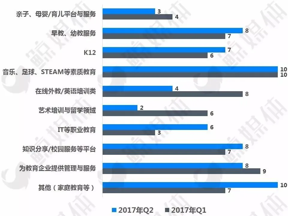 通过梳理我们发现,2017年Q2各个细分领域的投资热度和Q1基本相似,从早教、幼教到K12,从英语培训、素质教育到职业教育,从知识分享到为机构提供各种服务和技术等,各个细分领域融资不断。