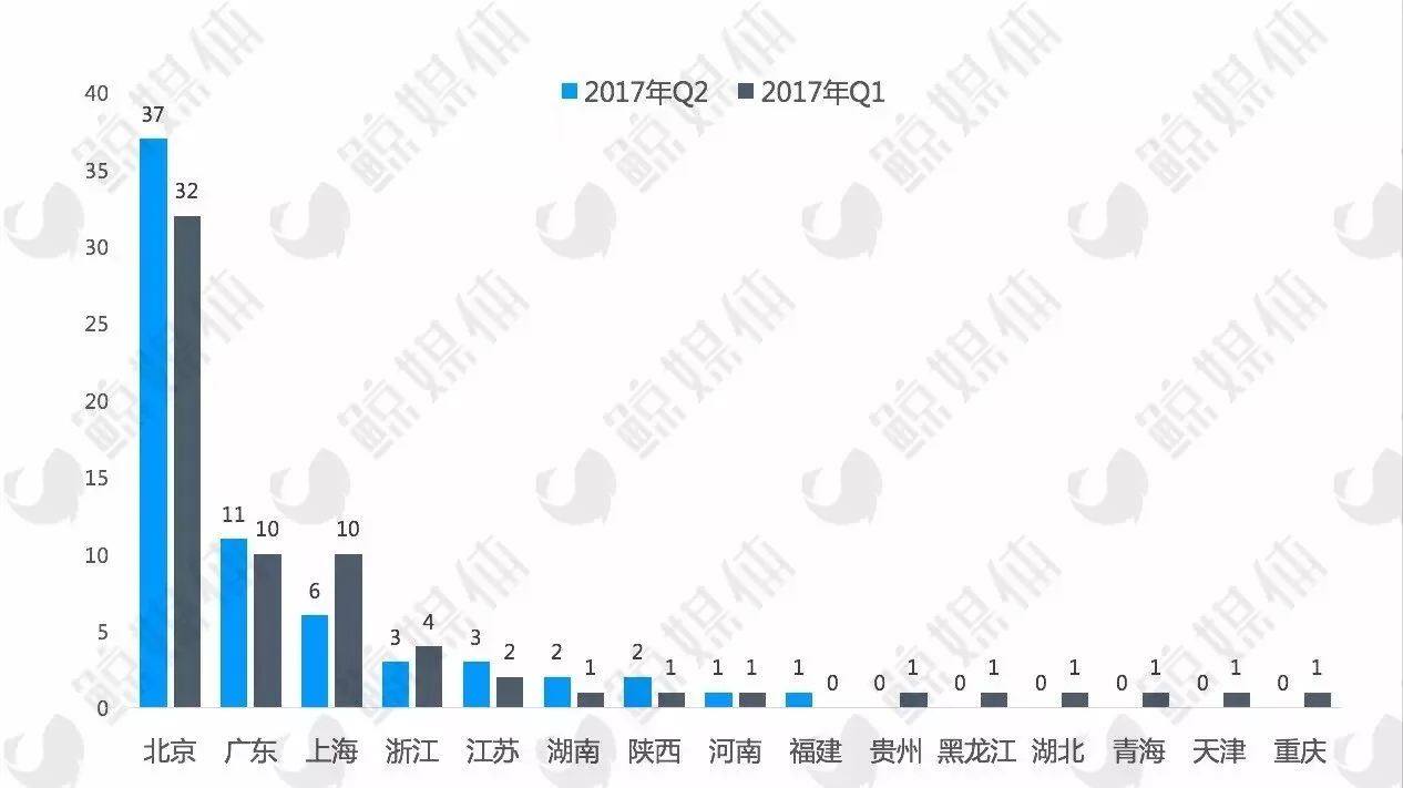 从上图地域分布的情况来看,整体而言,Q2获投的公司地域更加集中,而Q1较为分散。在Q2的66起融资事件中,北京的公司有37个,占比超过一半(56.06%);来自广东省(主要是深圳和广州)的公司有11个(占比16.67%)。与Q1相比,这两个地方获投的公司数都略多。不过Q2只有6家公司来自上海,比Q1少了4家。
