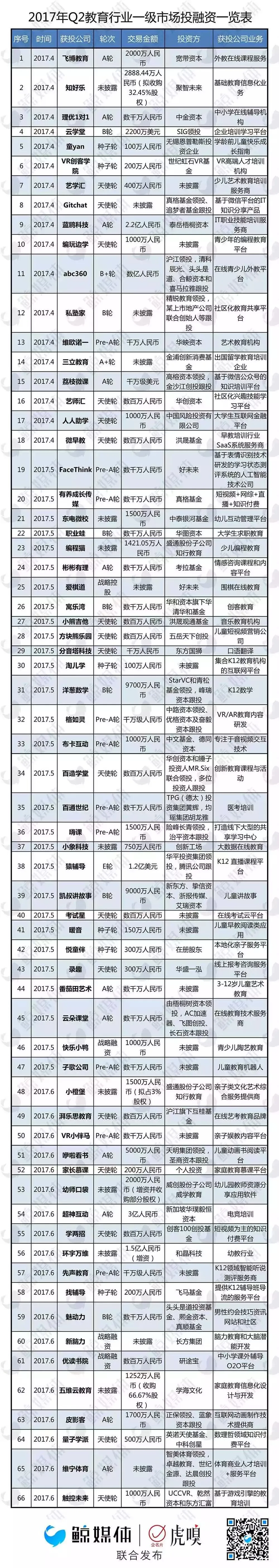 根据企名片及公开资料,经鲸媒体和虎嗅联合梳理和统计发现,2017年Q2教育行业一级市场共发生投资事件66起。值得注意的是,由于有些Q1的投融资案例是在Q2披露的,所以经过再次确认,2017年Q1的投资事件增至67起。