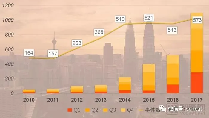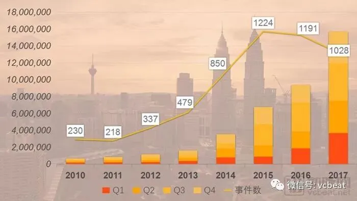 相比于2016年的1191起融资事件,2017年仅发生1028起,下降10%。在整体投资规模快速增长的背景之下,投资事件的下降使得单笔投资规模大幅上升。