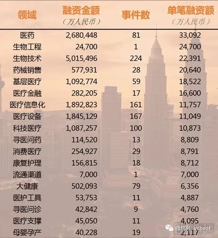 在发生融资的16个细分领域中,除四个细分领域出现了融资事件数的小幅增长外,行业的快速成熟使得其他细分领域出现了融资热度的下降,其中医疗设备、大健康、寻医问药等三个领域的下降最多。