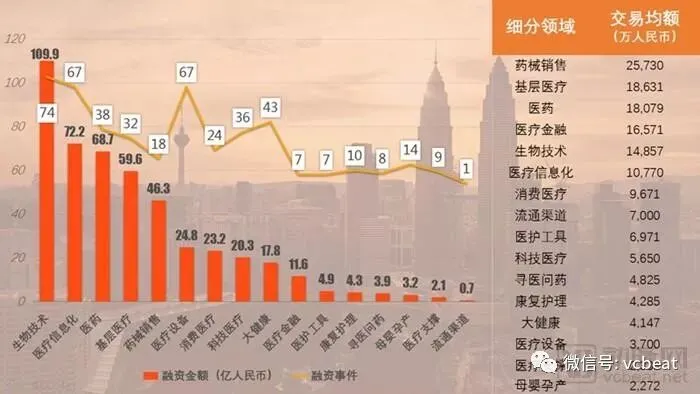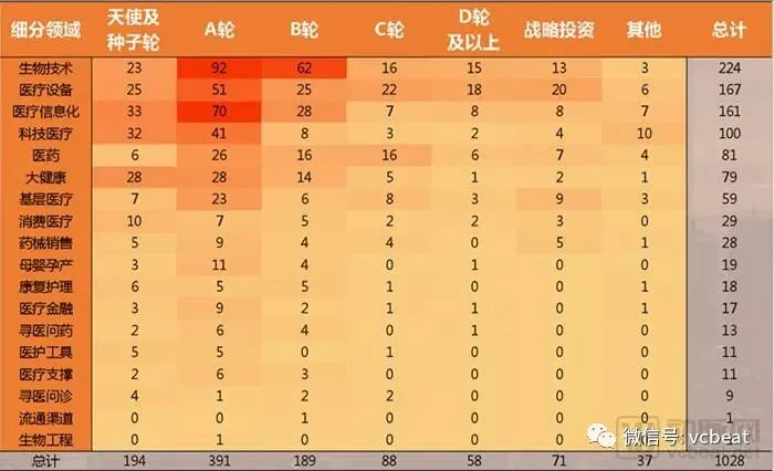 在细分领域的投资热度分布上,技术创新所建立的融资优势已经显现。有一定技术壁垒的细分领域,如生物技术、医疗信息化、医药等领域的投资热度明显高于其他领域;而服务模式创新的领域,如母婴孕产、寻医问药的投资热度在降低。