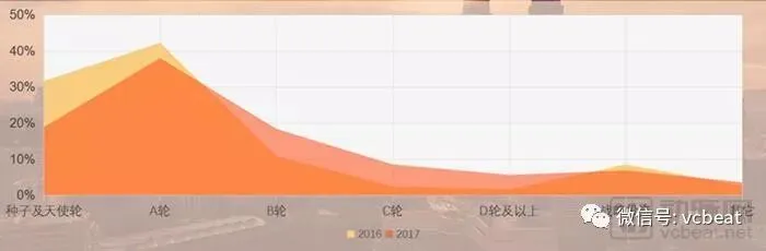 在投资轮次方面,A轮交易最多,共发生207起,占总事件数的46%,其占比相对于2016年有小幅增加。