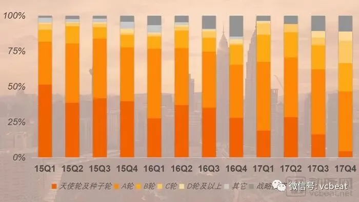 以早期投资轮次为代表的种子及天使轮为例,2016年共发生218融资事件,占当年总融资事件数的31.6%。2017年种子轮及天使轮共发生194起融资事件,占总融资轮次的18.9%。