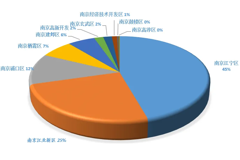 南京江宁区的融资金额在南京地区总融资金额中的占比最高,约为45%左右。
