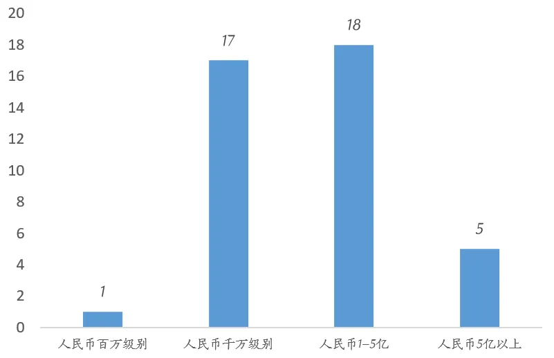 目前主要还是以1-5亿元人民币融资金额为主,其次为千万级别人民币融资金额。