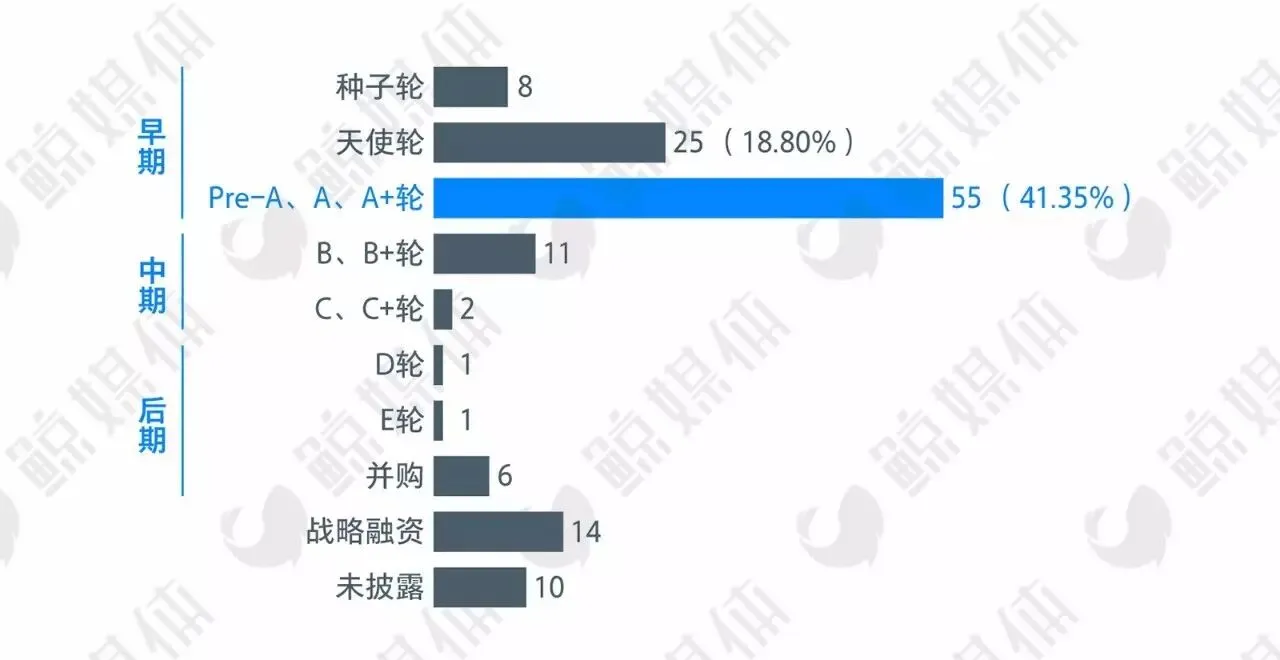 其次投融资事件较为活跃的领域是为教育企业提供教育服务与管理领域,共有17起事件,约占总数量的12.78%。这些领域中的教育机构融资都处于早期阶段,大多数为天使轮及Pre-A轮阶段。