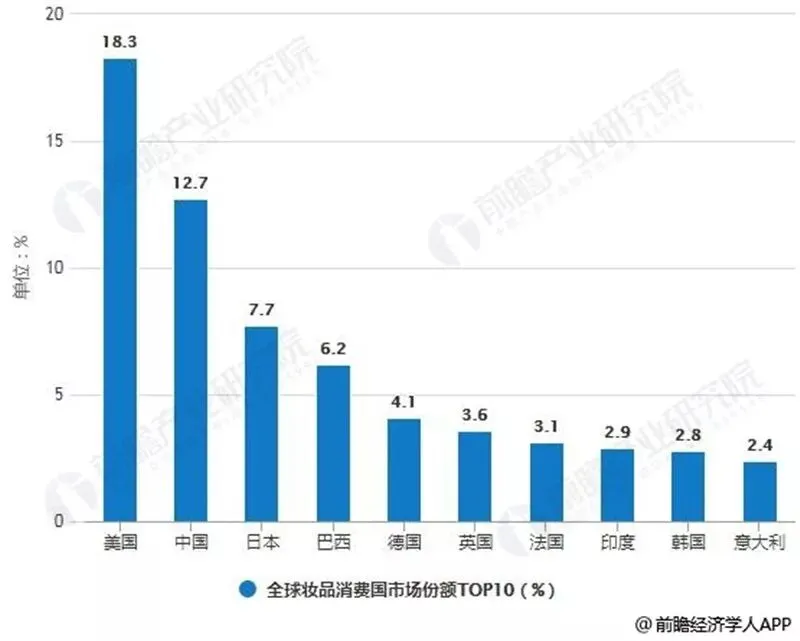 2018年全球妆品消费国市场份额TOP10统计情况
