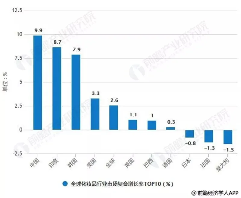 2009-2018年全球化妆品行业市场复合增长率TOP10统计情况