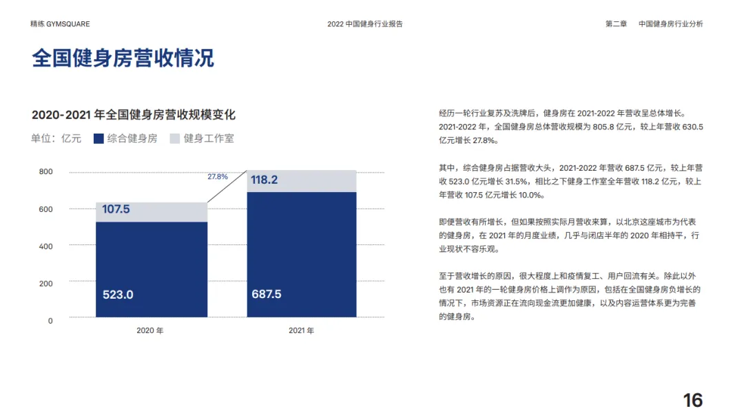 近期,精炼GYMSQUARE发布《2022中国健身行业报告》,报告通过问卷调研、第三方数据分析、教练、健身场馆和健身用户访谈等形式,收集整理了2021年健身行业的发展变化,从健身房行业、健身房用户、健身教练、线上健身和健身消费五大板块进行2022中国健身行业报告分析。