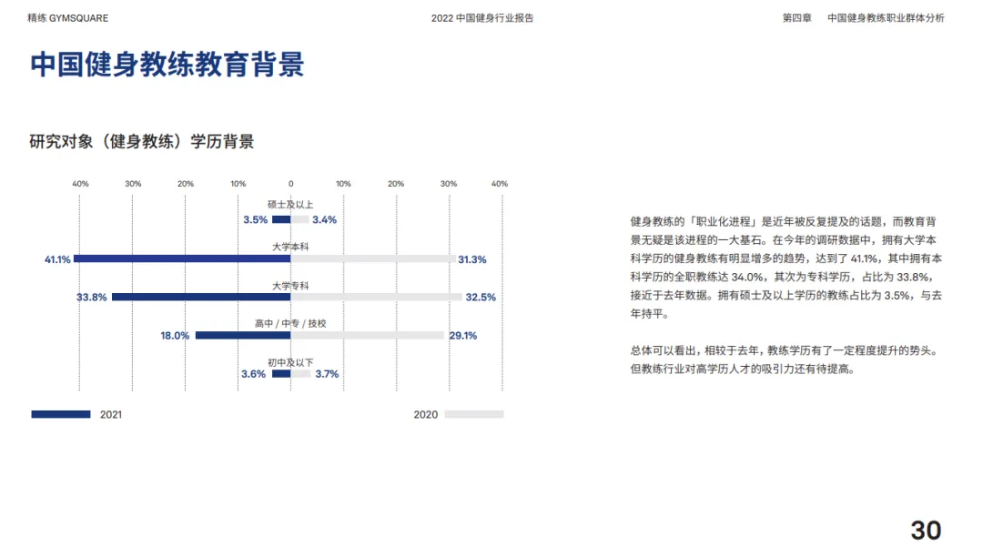 针对健身教练的调查数据显示,2021年,拥有大学本科学历的健身教练明显增多,达到了41.1%,其次为专科学历,占比为33.8%。在教练年龄方面,健身行业正在迎来新鲜血液,00后教练的占比已经从2020年的5.7%增长至14.3%。