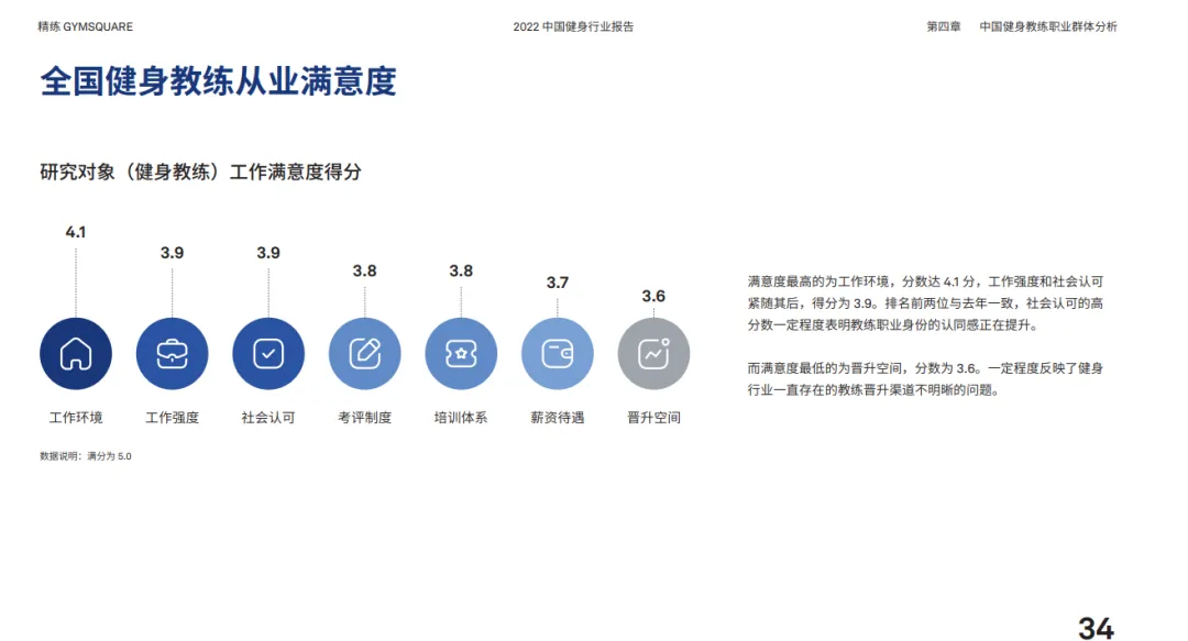 而在全国教练从业满意度的调查数据显示,在职健身教练满意度最高的为工作环境,分数达 4.1 分,工作强度和社会认可紧随其后,得分为 3.9。社会认可的高分数一定程度表明教练职业身份的认同感正在提升,健身教练职业地位在稳步提升。