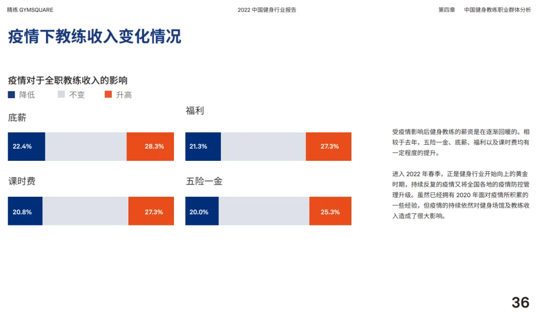 受疫情影响后健身教练的薪资是在逐渐回暖的。相较于去年,五险一金、底薪、福利以及课时费均有一定程度的提升。