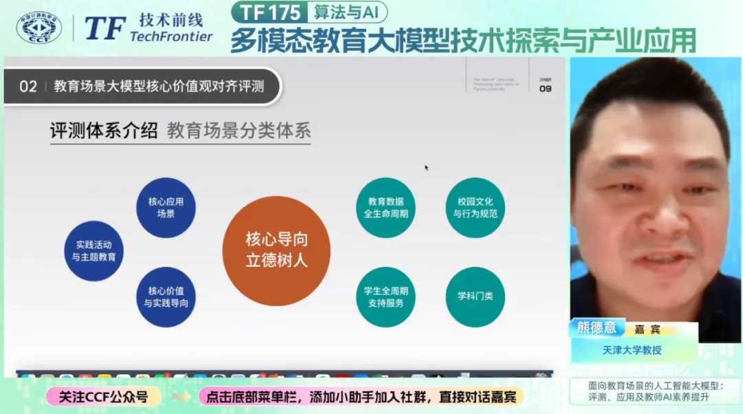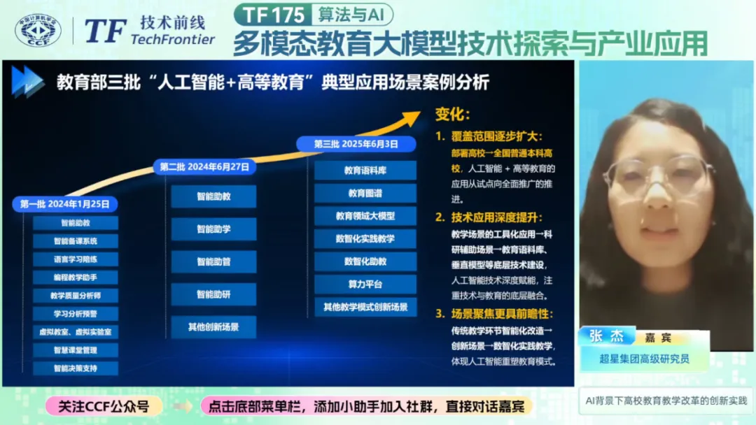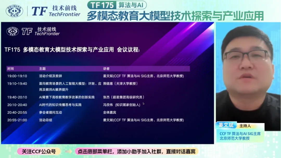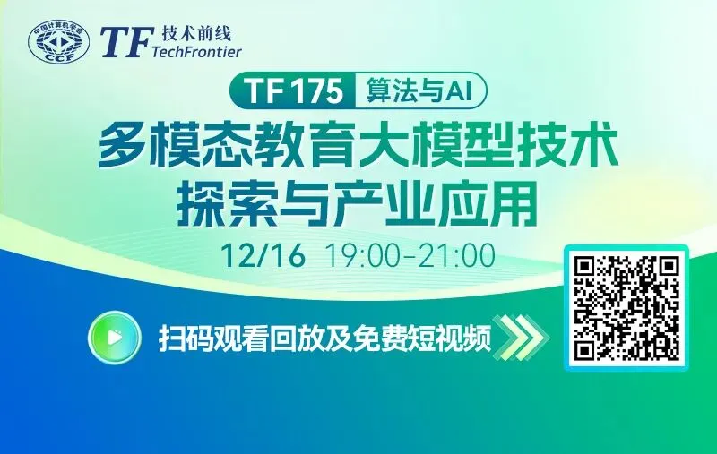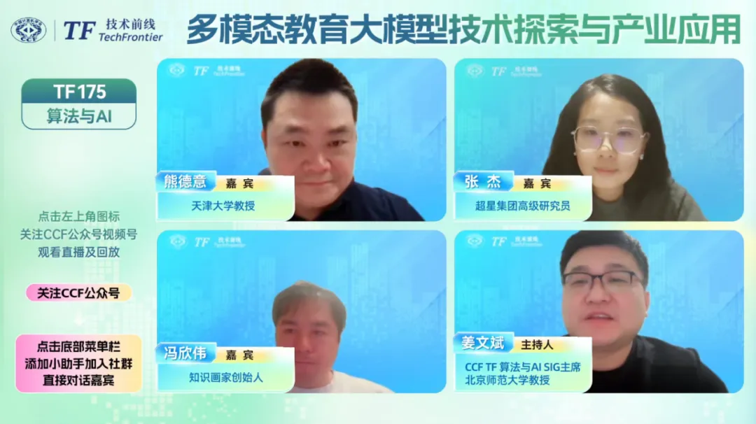 AI赋能教育作为人工智能与教育领域融合的核心方向,正深度重塑教育教学的模式与生态。随着大语言模型、多模态生成技术的持续突破,AI在教育场景的应用从工具辅助向智能赋能升级,为教学改革、知识传播与素养提升带来了全新可能。2025年12月16日,CCF TF175期 “多模态教育大模型技术探索与产业应用” 直播活动在线举办,邀请到天津大学熊德意教授、超星集团高级研究员张杰、知识画家创始人冯欣伟三位嘉宾带来精彩分享,共同探讨AI与教育融合的创新路径。