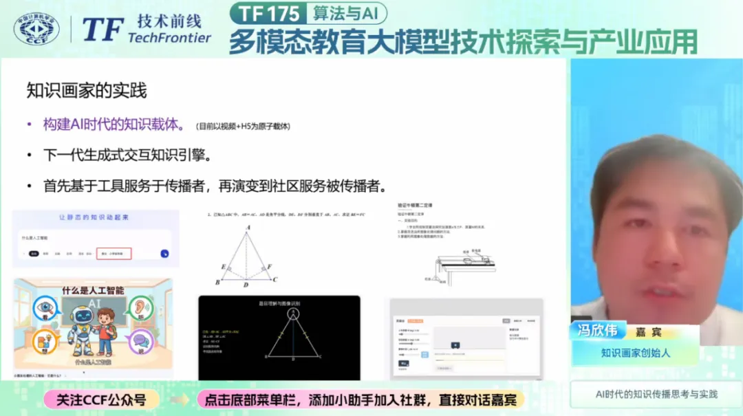 天津大学熊德意教授以《面向教育场景的人工智能大模型:评测、应用及教师AI素养提升》为题,围绕教育场景大模型的核心应用与发展痛点展开分享。在AI技术快速渗透教育场景的当下,“价值观对齐”与“合规应用”成为不可回避的关键命题。对此,熊教授带领团队构建了一套教育大模型评测体系——从精准制定评测标准、搭建专用数据集,到创新设计评测方法、深度分析实测结果,每一个环节都紧扣教育行业的特殊性,为教育大模型的合规化应用提供了依据。而在应用层面,熊教授介绍了大语言模型在语言学习辅助、教育Agent开发等场景的落地应用案例,展现了AI对个性化学习的赋能价值。面对AI时代教师面临的能力转型挑战,熊教授进一步提出教师AI素养提升指南框架,结合实践路径为教育工作者适应AI时代教学变革提供了具体方向。超星集团张杰高级研究员聚焦高校教育教学改革的迫切需求,以《AI背景下高校教育教学改革的创新实践》为主题,分享了一套可复制、可推广的转型方案。张杰以北大医学“厚道”大模型等校企合作标杆项目为例,深度拆解了学科专属大模型的构建逻辑——从技术研发阶段的需求适配,到场景落地时的流程优化,每一步都体现着“产学研协同”的智慧。而在教学改革层面,AI的介入正让传统课堂焕发新生:课程体系被重新解构,教学流程实现智能优化,原本繁琐的学情分析变得精准高效。张杰介绍的以学情为核心的智慧课程建设方法,通过动态追踪学习数据、科学调整教学策略,帮助教师为学生提供个性化人才培养方案,其落地成果也为更多高校推进教育数字化转型提供了可借鉴的实践范式。知识画家创始人冯欣伟以《AI时代的知识传播思考与实践》为题,带领观众回望知识传播的演进历程,展望AI赋能下的未来图景。从刻墙记事的远古时代,到纸笔书写的传统时期,再到数字传播的当下,知识传递始终受限于媒介形态——或传播范围狭窄,或理解门槛过高,或呈现形式单一。而AI技术的出现,正彻底打破这些束缚。冯欣伟指出,AI时代的知识传播,正朝着“可交互、多模态、个性化”的方向疾驰。这意味着知识不再是静态的文本,而是可互动、可感知、可适配的动态内容。他分享的“知识画家”产品,正是这一理念的生动实践:借助AI技术,产品能自动将抽象的知识转化为生动的视频、趣味的应用,让复杂概念变得直观易懂,不仅降低了知识理解的门槛,更让知识传播突破了时空限制。这份实践探索,为AI赋能知识传播提供了极具想象力的创新范式,也让“人人皆可高效学” 的普惠教育愿景更近一步。AI赋能教育创新的探索正不断走向深入,本次会议汇聚了高校学术研究、企业实践落地与创业项目探索的多方视角,为AI在教育领域的深度应用提供了思路与借鉴。期待未来更多产学研力量的融合,推动AI技术与教育教学的深度融合,助力教育行业的智能化升级与高质量发展。CCF 技术前线(TF),是专为企业一线工程师搭建的合作交流平台,通过12个SIG(特别兴趣小组)覆盖架构、人工智能、云原生、安全工程、智能制造等核心领域,聚焦技术落地痛点,助力工程师突破职业瓶颈。