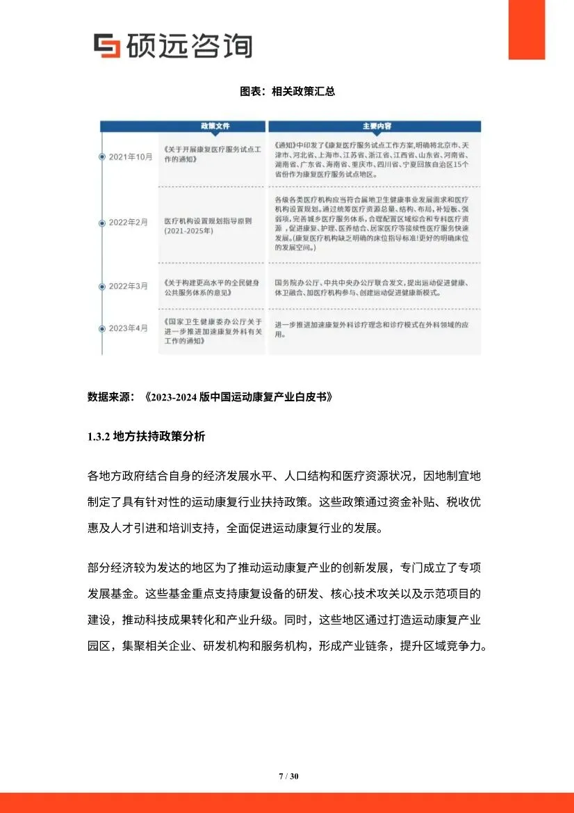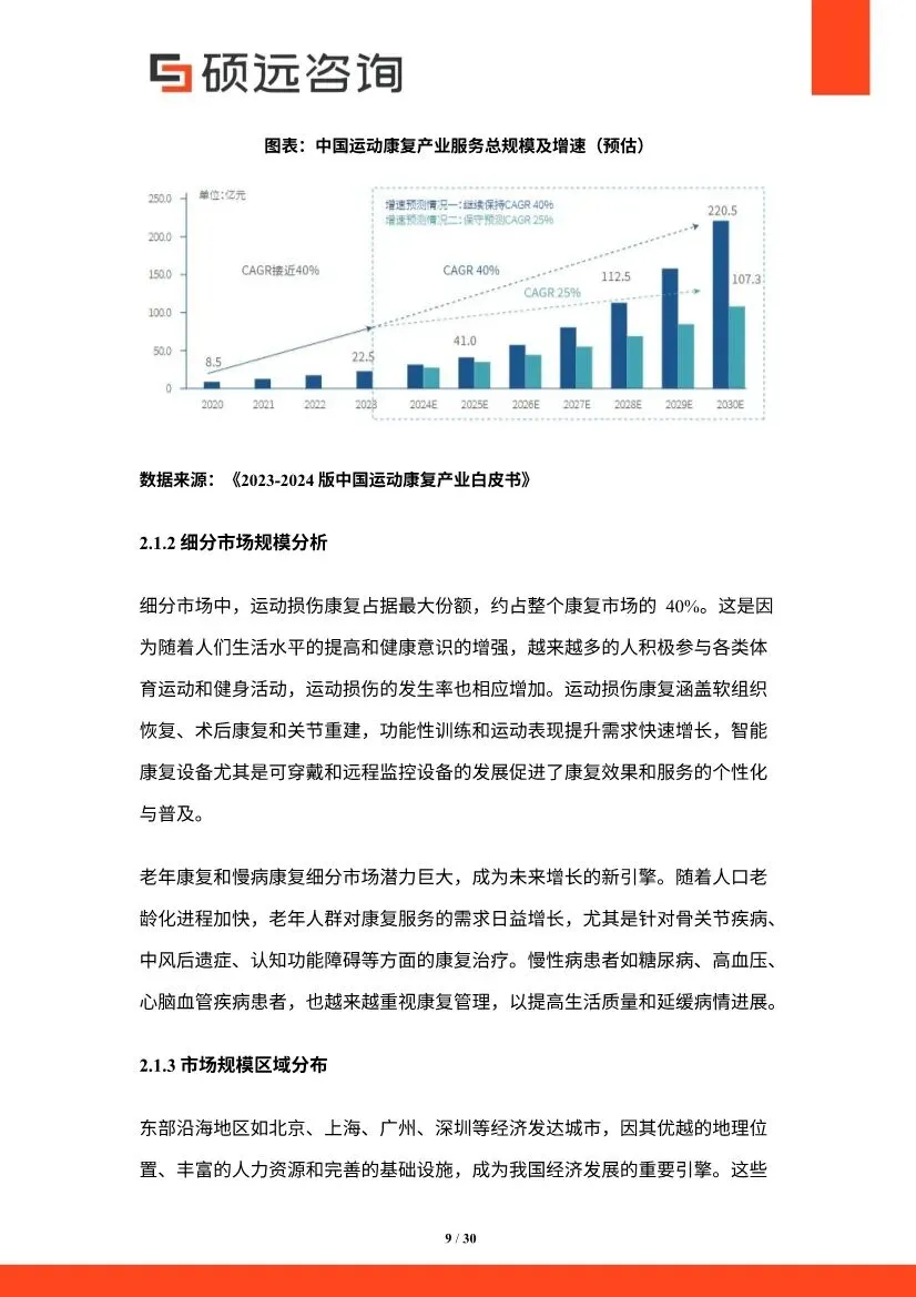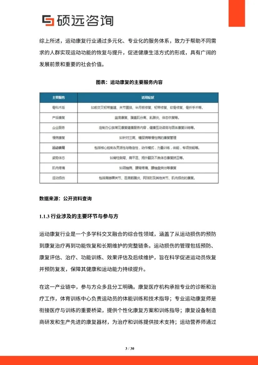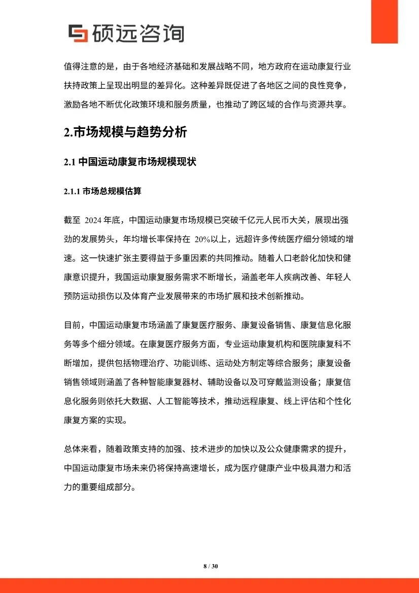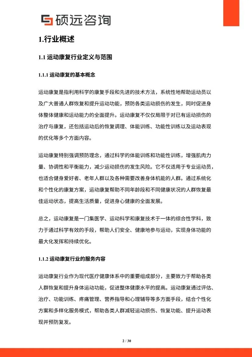 这是一份由硕远咨询编制的《2025年中国运动康复行业市场研究报告》,全面剖析了中国运动康复产业的现状、趋势与竞争格局。以下是对报告核心内容的深度解读分析:中国运动康复行业已进入高速发展通道,2024年市场总规模已突破千亿元人民币大关,年均增长率保持在20%以上,远超传统医疗细分领域的增速。这一强劲增长背后,是人口老龄化加速、全民健康意识觉醒与体育产业蓬勃发展三重因素的叠加驱动。从服务结构看,市场呈现明显的需求集中特征。运动损伤康复占据最大份额,约占总市场的四成,涵盖骨科术后恢复、软组织损伤、关节功能重建等核心领域。紧随其后的肌骨疼痛管理(21.6%)和姿势体态矫正(13.3%)也占据重要地位。值得注意的是,产后康复、慢病康复等新兴领域虽然目前占比较小,但增长潜力巨大,正成为行业新的增长点。区域分布上呈现出典型的"东强西弱"格局。一线及新一线城市集中了约67%的康复机构门店,其中北京、上海、广州、深圳凭借经济优势、人才储备和完善的医疗体系,成为行业发展的核心引擎。中西部地区虽起步较晚,但在政策扶持下正快速追赶,未来增长空间广阔。报告揭示了运动康复服务鲜明的客户特征。年龄结构上,19至40岁的年轻及中年群体占比高达52.9%,构成核心消费群体,他们既包括追求运动表现提升的健身爱好者,也涵盖因长期伏案工作导致慢性损伤的上班族。性别分布相对均衡,男性客户比例略高,反映出男性在运动参与度和损伤发生率上的特点。支付结构格外引人注目,自费比例高达86.7%,医保报销仅占3.3%,商业保险占比不足5%。这一数据凸显出运动康复服务尚未充分纳入主流医疗保障体系,也暗示着巨大的商业保险合作空间。高端客户对价格敏感度低,更看重专业性与服务品质,愿意为个性化方案支付溢价;而大众市场则对性价比高度敏感,决策易受促销活动影响。消费者决策呈现出典型的"效果导向"特征。服务质量与康复效果是首要考量因素,客户会重点评估机构的专业资质、康复师的经验水平、方案的科学性以及环境设备的先进程度。口碑推荐在获客中扮演关键角色,数据显示,39%的门店通过口碑推荐获得40%-60%的新客户,22.7%的门店甚至通过口碑获取超过60%的新客户。这表明行业具有较强的社群传播属性,客户满意度直接决定机构增长可持续性。行业集中度逐步提升,形成"强者恒强"的格局。龙头企业凭借资金实力、技术积累和品牌影响力,在全国布局分支机构,构建完善的服务网络。它们通常在康复医疗设备研发、专业人才储备、标准化服务流程等方面建立护城河,并通过连锁化运营实现规模效应。中小企业则采取"灵活游击"策略,在细分市场寻找生存空间。它们的优势在于快速响应能力、个性化服务深度和区域市场渗透力。部分创新型中小企业聚焦特定领域(如青少年脊柱侧弯矫正、马拉松运动损伤防护),通过技术特色和服务差异化建立竞争优势。但受制于资金与品牌短板,整体市场份额仍有限。竞争策略上,产品与服务创新成为核心战场。智能化康复设备、功能性康复机器人、生物力学辅助系统等高端产品逐步普及。服务模式从传统的线下治疗向"线上评估+线下康复+远程监控"的融合模式演进。品牌建设方面,企业加大数字营销投入,通过社交媒体、KOL合作、内容营销等方式触达年轻消费群体。资本层面,行业融资活动活跃。以优复医疗、复动肌骨为代表的头部企业接连获得数千万美元及近亿元级别的融资,表明资本市场对行业前景的高度认可。并购整合趋势显现,大型企业通过收购创新型中小企业快速获取新技术与业务模式,跨行业合作(医疗+体育+科技)也日益频繁,产业链协同效应增强。技术创新是驱动行业变革的核心引擎。当前运动康复已深度应用信息化管理系统,实现客户数据、治疗方案、康复进度的全流程数字化管理。智能穿戴设备与物联网技术可实时采集心率、血氧、运动轨迹等生理指标,通过云端传输实现远程监控,极大提升了服务的可及性与连续性。人工智能的应用尤为突出。通过图像识别与运动捕捉技术,系统能自动分析患者动作规范性,提供实时反馈与纠正建议。AI算法还能基于海量康复数据预测最佳治疗方案,缩短康复周期。康复机器人辅助技术已能精准引导患者完成重复性训练,减轻康复师工作强度,提升干预一致性。虚拟现实(VR)与增强现实(AR)技术正在改变传统康复模式。患者可在虚拟环境中进行趣味化训练,提升依从性;医生则通过AR技术实现远程指导,突破地理限制。这些技术不仅优化了用户体验,还通过减少人工干预降低了服务成本,为规模化扩张提供可能。尽管前景广阔,行业仍面临多重制约因素。首要挑战是支付体系不健全,高昂的自费门槛限制了服务普惠性,医保覆盖不足与商保介入滞后制约了市场扩容。其次是专业人才短缺,运动康复师培养周期长、认证体系不完善,难以满足快速增长的需求。此外,标准化程度低导致服务质量参差不齐,不同机构间方案差异大,影响行业整体公信力。政策层面存在不确定性。环保要求提升可能增加运营成本,医疗监管趋严对机构资质提出更高要求。市场竞争加剧背景下,中小企业生存空间受挤压,同质化竞争可能引发价格战,损害行业健康发展。技术研发层面,应加大与高校、科研院所的产学研合作,聚焦智能设备、AI算法