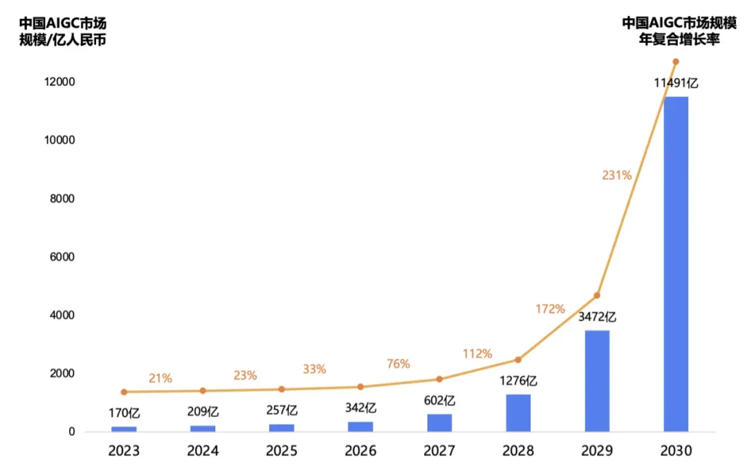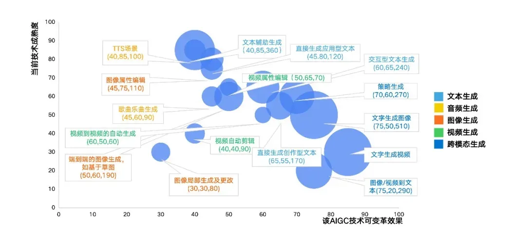基础设施层:数据服务板块成产业新增量,算力和算法产业生态格局较为确定AIGC对训练数据的体量、所属行业领域、对应垂直业务和颗粒度都有极高的要求。对于预训练大模型而言,多模态的数据集至关重要。此外,为了使训练问答和产出达到预期效果,数据提供方需要保障数据的即时性和有效性。目前,全球规模最大的开源跨模态数据库是LAION-5B,全球首个亿级中文多模态数据集“悟空”则是由华为诺亚方舟实验室开源。自各类大模型进入大众视野以来,其tokens的大小限制一直困扰着诸多开发者和使用者,以GPT为例,当使用者向其发送命令时,程序会自动将最近几次对话记录(基于对话的字数限制在4096 tokens内)通过prompt组合成最终的问题,并发送给ChatGPT。一旦使用者的对话记忆超过了4096 tokens,那么它就难以将之前的对话内容纳入到逻辑思考范围,这就导致目前GPT在面对比较复杂任务时容易出现AI幻觉。在此背景下,开发者们不断寻求新的解决方案,向量数据库就是热门解决方案之一。向量数据库的核心概念是将数据转换成向量存储在数据库中;在使用者输入问题时,也将问题转换成向量,然后在数据库中搜索最相似的向量和上下文,最后将文本返回给用户。这样不仅可以大大减少GPT的计算量,从而提高响应速度,更重要的是降低成本、支持多模态数据,并绕过了GPT的tokens限制。随着Weaviate MongoDB等海外向量数据库成为资本关注的对象,国内腾讯、京东等大厂也纷纷在此领域着手布局。相比于数据板块,国内算力和算法基础领域供给端仍以头部企业为主,初创型企业机会相对较少。但以人工智能计算架构为基础,为应用层提供所需算力服务、数据服务和算法服务的智算中心已成为新型公共算力基础设施之一。如AIDC OS,是九章云极DataCanvas自主研发的智算专属AI操作系统。同时面向智算中心大规模算力和大中型企业内部智算集群,输出智算资源的纳管、统一调度,智算业务的业务运营支撑,以及AI模型的构建、训练和推理等核心能力。AIDC OS将算力运营方的运维能力从裸算力设备运维提升至AI大模型运维能力,加之对各类异构算力和AI应用的开放兼容,AIDC OS成功实现了算力资产附加价值的有效提升。模型层:国内市场玩家多集中在底层通用大模型,中间层玩家较少AIGC底层通用大模型可分为开源和闭源两类。闭源模型一般通过付费的API或者有限的试用接口来访问,国外闭源模型包括OpenAI的GPT模型、谷歌的PaLM-E模型等。国内闭源模型厂商起步较晚,但在多模态交互能力和与智能硬件结合方面的能力提升迅速。如近期李未可科技研发的WAKE-AI大模型,具有文本生成、语言理解、图像识别及视频生成等多模态交互能力,是李未可科技专为未来 AI+终端,定向优化研发的多模态AI大模型平台。目前WAKE-AI大模型暂时针对李未可科技旗下的智能终端——AI眼镜、XR眼镜上使用。未来李未可科技将开放该AI平台,即让更多开发者以低代码或无代码的方式,在各类终端上快速低成本的部署或定制多模态AI。开源模型采用公开模型的源码与数据集,任何人都可以查看或修改源代码,如Stability AI开源Stable Diffusion,Meta开源Llamax,xAI开源Grok-1,中国智源开源Aquila。比较而言,闭源模型的优势在于前期投入成本低、运行稳定;开源模型则基于私有化部署拥有较高的数据隐私安全保障,并且迭代更新速度较快。目前国内多数大模型开发企业或机构致力于开发跨模态大模型,如腾讯的混元AI和百度的文心大模型,都可进行跨模态生成,但整体尚未普遍形成开源生态。中间层模型市场玩家大致可分为垂类大模型和中间集成商两类。其中,垂类大模型对于垂直行业的业务理解和资源积累要求较高,中间集成商负责组合多个模型接口,形成新的整体模型。以AI游戏引擎公司RPGGO为例,对于个人用户而言,RPGGO基于自研的游戏引擎Zagii Engine,能够协助个人创作者简化开发流程,实现最大化的创意输出;对于游戏工作室而言,RPGGO能够提供API联动,提升游戏开发效率。就战略合作或产品布局而言,国内底层大模型厂商正发力布局中间层及终端应用层,以此为自身的底层大模型产品提供能力出口和数据入口,如针对未来智能终端提前布局多模态AI平台的李未可科技等。AIGC产业应用层多是基于模型能力和对用户需求的洞察,直接面向B端或C端客户进行服务,可将其简单理解为移动互联网时代的各类工具,未来的潜力空间较大,大批初创企业可参与其中。如果按照模态划分,应用层可分为文字生成、音频生成、图像生成、视频生成、跨模态生成和策略生成。由于NLP技术发展历史较久,因此文字生成属于发展时间最长、落地应用也最为成熟的赛道。而在这波AIGC发展热潮中,跨模态生成将会带来最多的新应用场景。其中,文字生成图像、文字生成视频和图像/视频生成文本均已有产品问世,尤其是文字生成图像,如Stability AI,已经在全球范围内有了C端用户量的证明。根据量子位智库对不同模态不同应用场景技术成熟度、应用成熟度和未来市场规模的估算,目前文本生成中,文本辅助生成赛道规模潜力最大;跨模态生成中,文字生成图像/视频赛道规模潜力最大。图示:AIGC产业应用层不同赛道发展预测,圆圈大小表示预估2030年,该赛道相对市场规模根据量子位智库数据,2023年中国AIGC市场规模约为170亿元,预计2025年之前,中国AIGC市场规模增长率都将维持在
