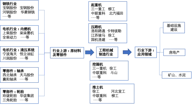 从产业链角度来看,工程机械产业上游主要为材料行业、电机行业和零部件制造业,为工程机械产品制造提供原材料及零部件,如工程机械用钢材、内燃机、液压系统、轴承、轮胎等;中游包括挖掘机、起重机、压路机、推土机等不同类型的工程机械制造企业;下游主要为工程机械应用领域的行业,如基础设施建设、房地产、矿山挖掘、水泥以及农村建设等。