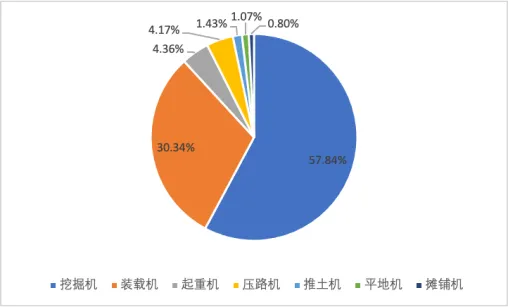 挖掘机占据市场的绝对主流,销售占比为57.84%。从市场结构来看,挖掘机、起重机、压路机以及推土机这四个工程常用器械占据了我国工程机械市场上绝大部分的份额,其中,挖掘机占据市场绝对主流,其次为装载机,2019年销量占比分别为57.84%、30.34%。