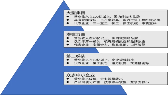 第一梯队为三一重工、柳工、徐工机械和中联重科营收规模在100亿以上的大型集团,其中三一重工和徐工机械营收在400亿元以上,产品遍布各个细分领域,技术水平领先,多项产品达到国际领先水平。