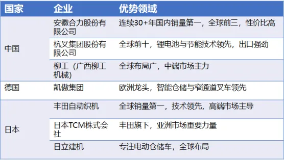 全球电动叉车的竞争格局呈现“两超多强”格局,中国双雄安徽合力、杭叉集团凭借规模与性价比占据全球销量前列,欧洲凯傲(林德、永恒力)、日本丰田则在高端市场保持技术与品牌优势。