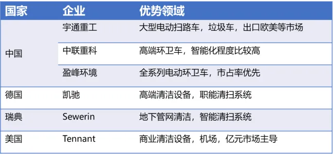 电动环卫车呈现中欧企业主导格局,中国头部如宇通重工、中联重科凭借全链条制造优势主攻中高端车型与海外市场,德国凯驰等国际品牌在高端清洁设备领域保持技术领先。