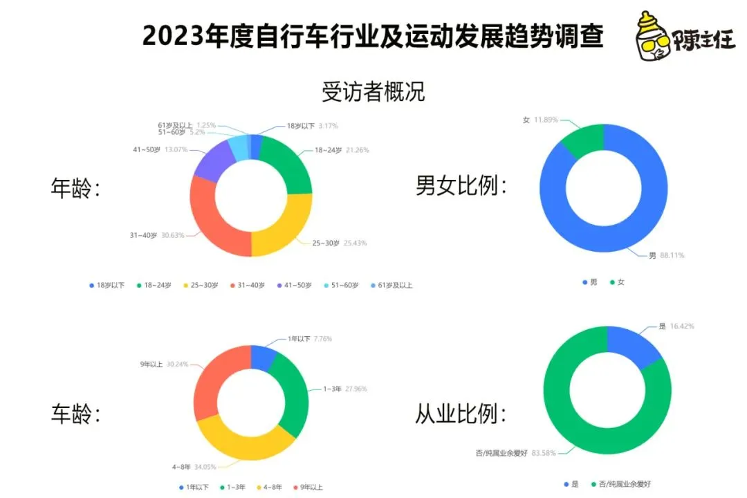 参与本次调查的受访者情况如上。年龄方面,18-40岁的青壮年段占据85%左右,与往年基本一致。女性受访者比例突破10%,成为历年调查之最;可以理解为近一两年的骑行热对女性的影响较大。车龄方面,3年以下的有超过三分之一,同为历年之最。今年新增了从业者统计,受访者中有16%为从业者(厂商、车店、赛事主办方、车队车手等)。