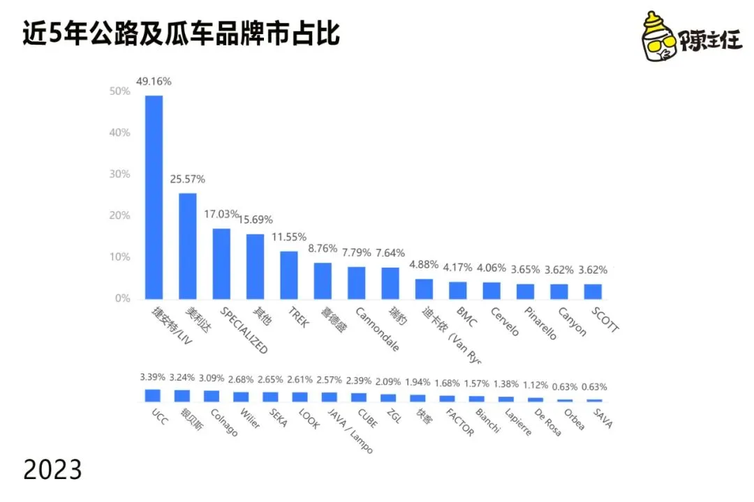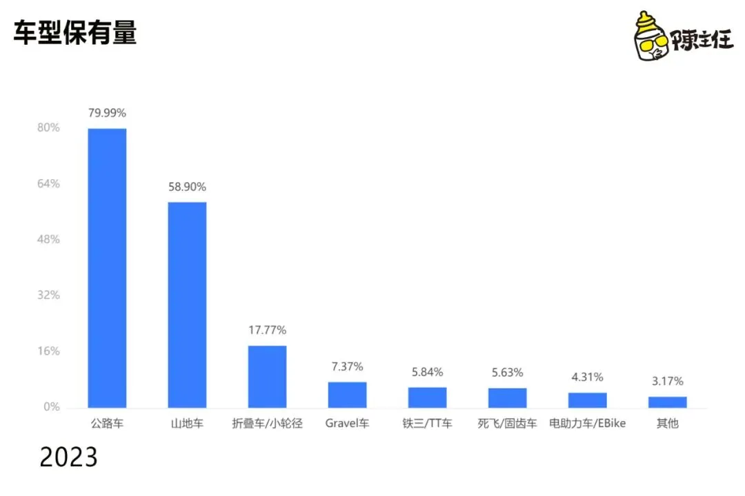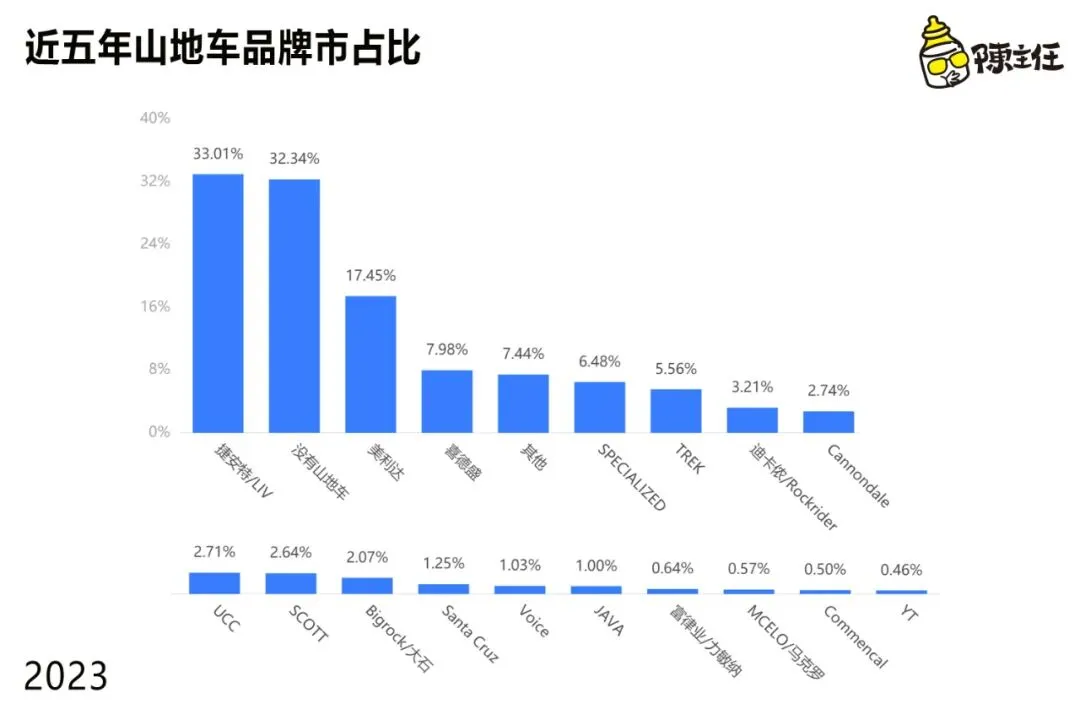 今年新增了针对山地车的调查,目前捷安特和美利达在山地车领域也是排名前二的。喜德盛的占比高于闪电崔克,该品牌随着封宽杰和郭鑫伟的加盟,中高端XC车也支棱起来了。考虑到山地车的范围比较大,把山马、XC和重型山地车品牌放在一起比占有率不是很科学,仅供参考。