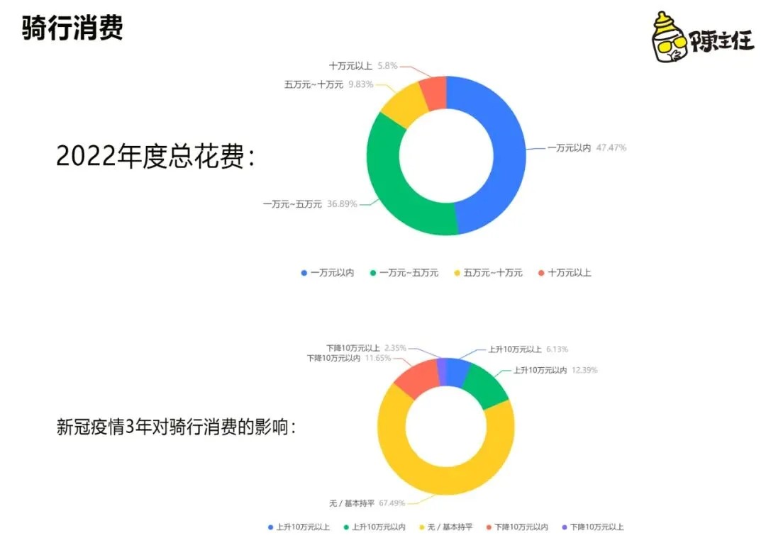 与主力车型价位统计对应的是,47%受访者在2022年骑行消费不到一万元,花费大于六位数的人只占了5.8%。至于骑行消费是否受疫情影响,三分之二受访者认为没啥影响,甚至预算上升的比例比预算下降的比例要大。