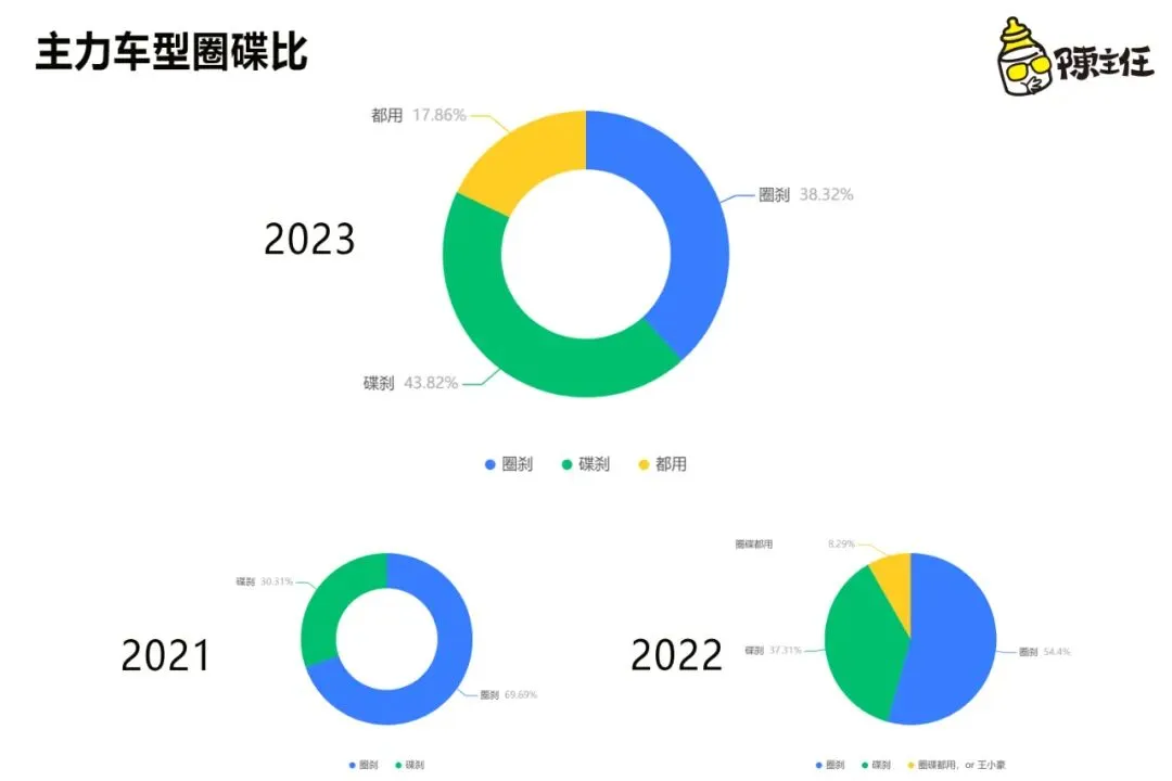 鸡车友最爱的圈碟之争环节——今年以碟刹作为主力车的比例首次超过圈刹(2021年的调查没有设置中间选项),不难看出近三年市场转变之迅猛。