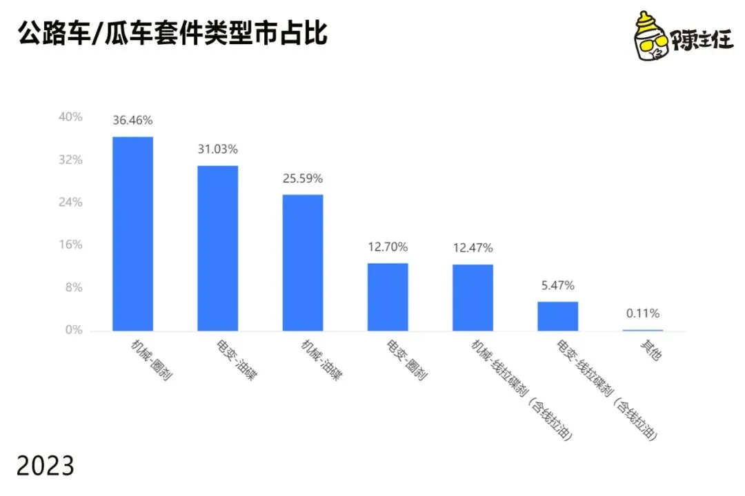 ·机械+油碟有着25.6%的占比,是电变+圈刹的两倍,可见油碟比电变普及得好。
