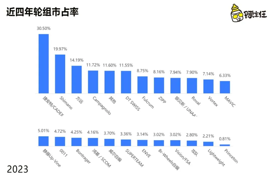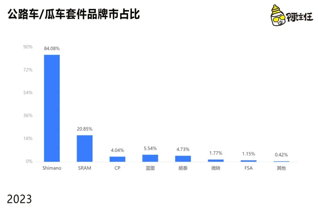 公路套件品牌的市占比,御三家中的CP可以说虚有其名,禧玛诺的地位难以撼动。国产继续加油吧。