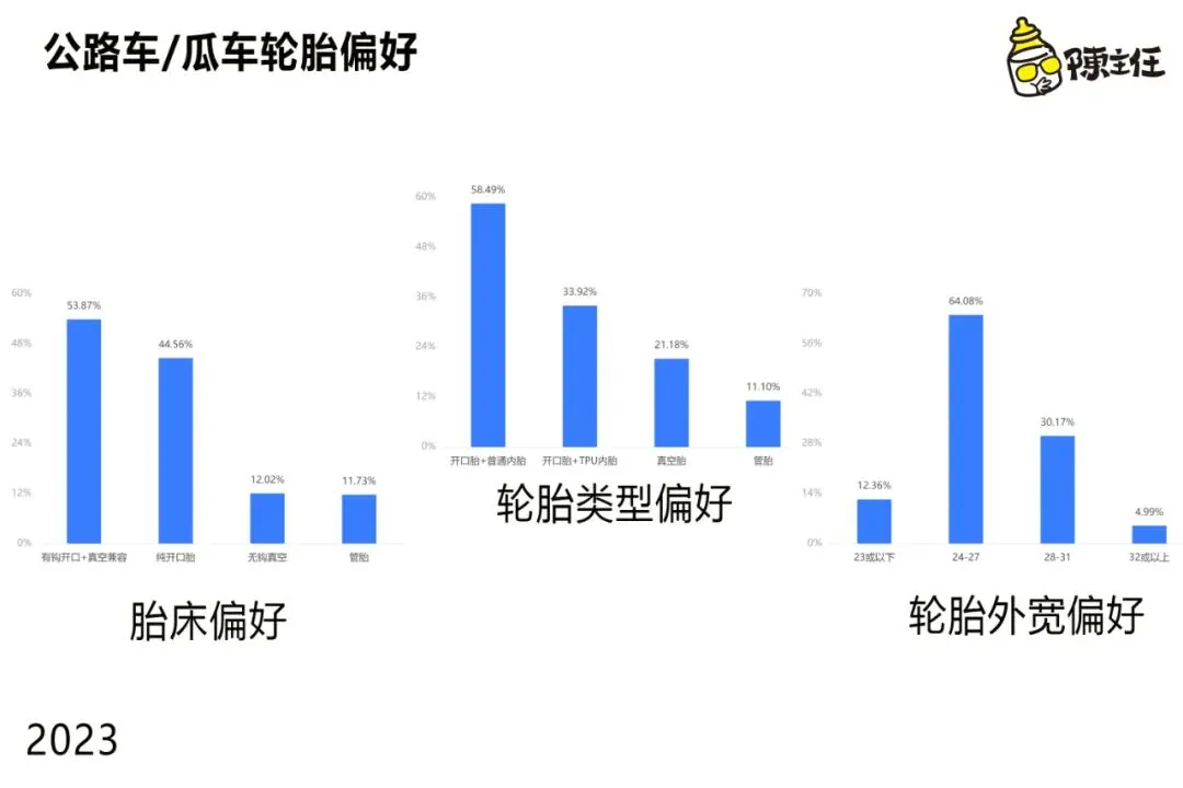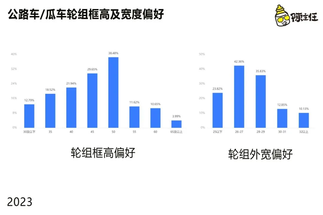 ·轮胎宽度方面,24-27c占据64%,是目前的主流;28c+虽然舒适性好,适合耐力骑行,但普及仍需时间。至于23c及以下,可以归为时代的眼泪了。
